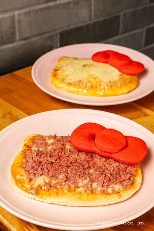 Disponíveis nos sabores queijo, calabresa e doce de chocolate com confeitos, as pizzas têm formato inspirado na Hello Kitty, incluindo o clássico laço vermelho, característica marcante da personagem.